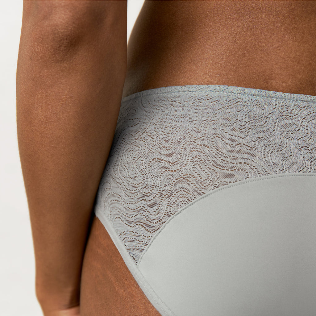 This beautiful, lingerie-inspired underwear designed in Paris is strong, sustainable, and stunning. Just like you. Silky smooth body fabric made of post-consumer recycled water bottles, with soft-stretch European lace for the most stunning period underwear you'll own.